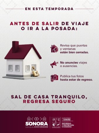 Hermosillo, Sonora; 18 de diciembre de 2025.- Con la llegada de las fiestas decembrinas, muchas personas y familias se preparan para disfrutar de sus vacaciones. Para que este periodo sea sinónimo de descanso y tranquilidad, el Centro Estatal de Prevención del Delito y Participación Ciudadana (CEPDyPC) exhorta a la comunidad a adoptar medidas preventivas en el hogar que reduzcan el riesgo de incidentes.