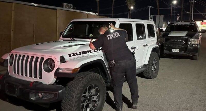 Mientras tanto, en la colonia Eleazar Ortiz localizaron un vehículo Jeep, línea Rubicon de color blanco que resultó con reporte de robo en el extranjero.