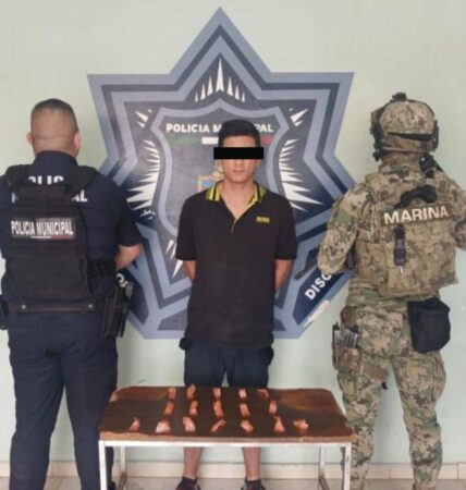 Ese mismo día, en la colonia Cedros 2, elementos municipales y de la Marina detuvieron a Rafael Enrique “N.”, de 27 años de edad, a quien se le aseguraron 17 envoltorios de plástico que contenían una sustancia granulada con características similares al narcótico “cristal”.